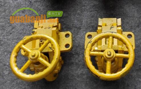 闸盘紧链装置采用闸盘紧链器与阻链器共同完成。它是利用输送机动力部提供给链轮轴组的旋转动力来张紧刮板链。目测刮板链松紧适度时,用紧链器将减速器第一轴制动,使刮板处于静止张紧状态,待将刮板链断点闭合后,松开被制动的一轴,使刮板链恢复自由张紧状态,便完成了张紧工作。紧链器紧链时,安装在减速器第一轴闸盘上,其制动或松开是通过紧链器的制动器来控制。当顺时针转动转动手轮时通过导套内的丝杠带动钳臂合拢,从而闸块抱住闸盘起制动作用。反之,若逆时针松开手轮则钳臂张开解除制动。